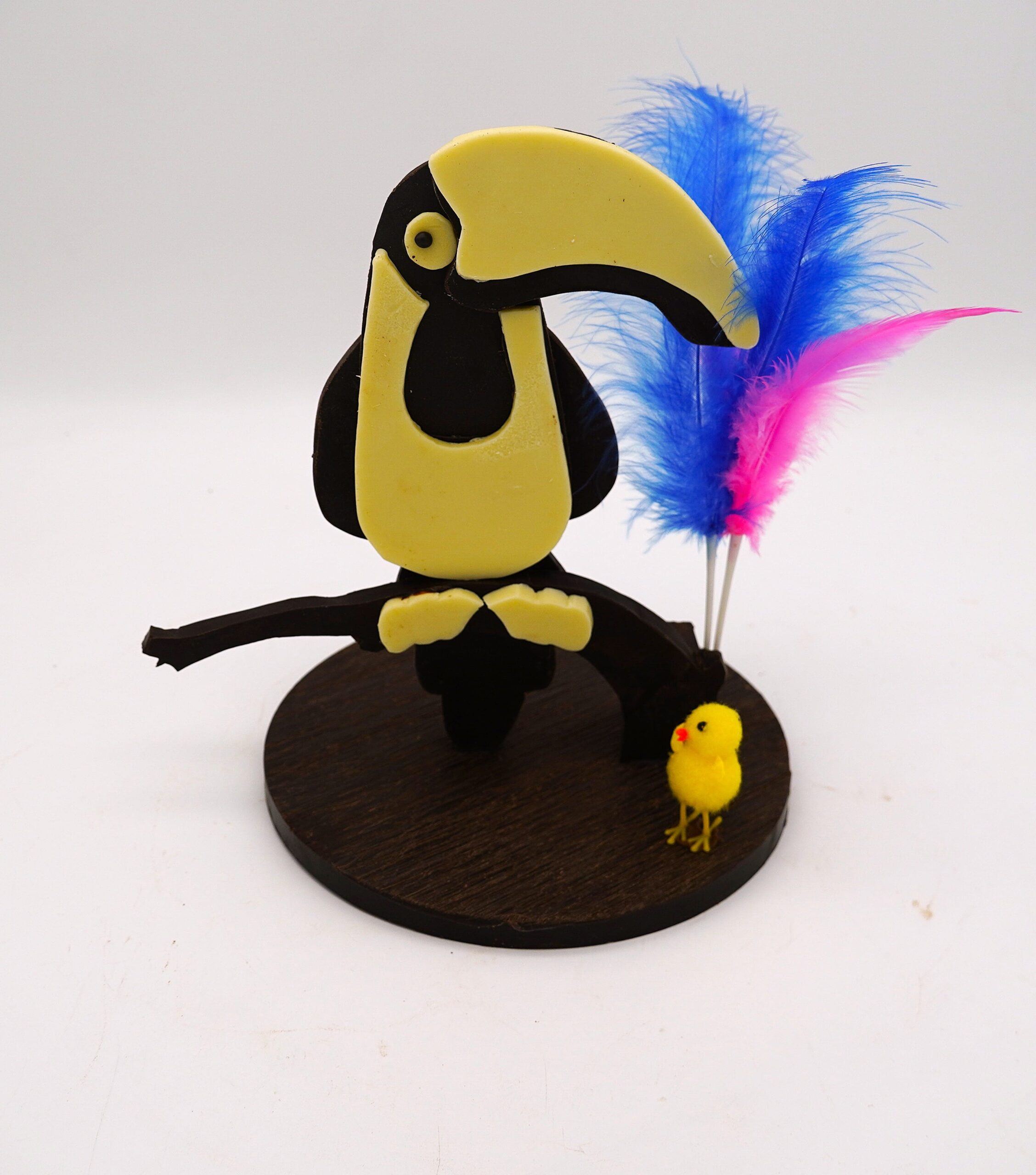 Divertida mona de xocolata amb forma de tucà, elaborada amb xocolata amb llet, negra i blanca. Una figura plena de color i sabor per celebrar la Pasqua amb un toc exòtic i molt dolç. 🐦🍫